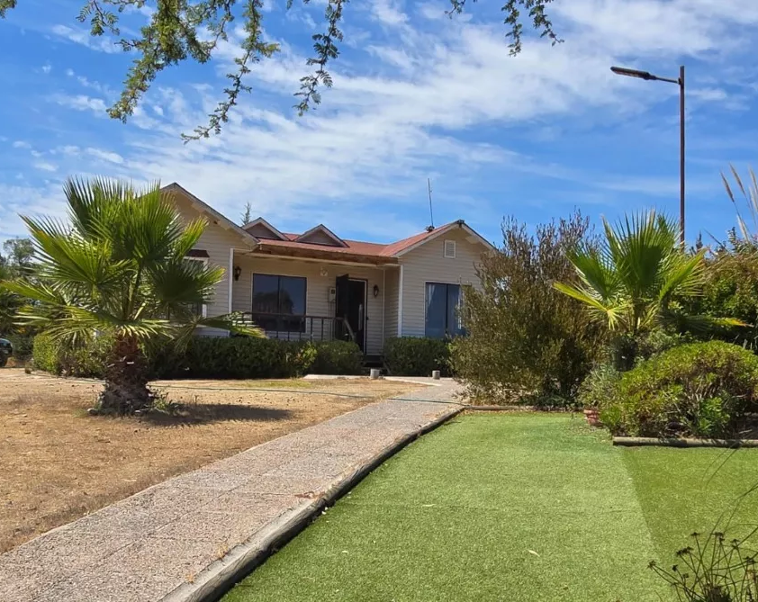 La propiedad incluye vivienda de 70 m² de tabiquería, con 3 dormitorios (principal en suite), 2 baños, living, comedor, cocina amoblada; además de quincho de 54 m² con baño, piscina, terraza, bodega, árboles frutales y paneles solares.